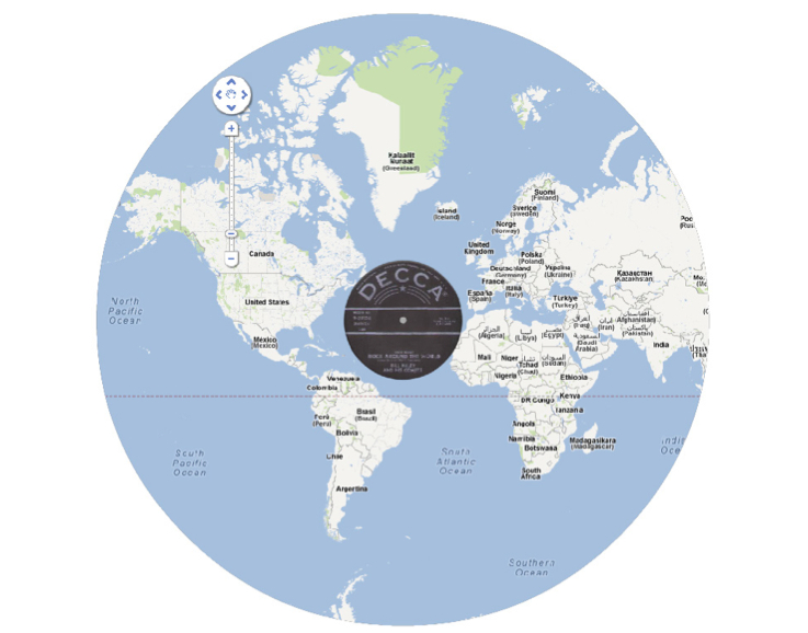 Rock Around The World Le monde devient un disque vinyle. Rock Around The World est une carte interactive qui utilise le célébre service de cartogrpahie Google Maps. La carte manipulable est représentée comme un disque vinyle qui se met à tourner lorsque que l’internaute clique au milieu du disque. Lorsque la terre se met à tourner, on entend la musique de Bil Haley “Rock Around the Clock”, célèbre titre de rock’n roll des année 60. |