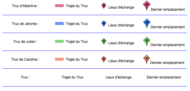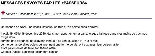 Pour le Jeu de Paume, le collectif Microtruc a imaginé Les Trucs, des objets mis en circulation, qui passent de main en main selon un protocole prédéfini. Ils sont géolocalisés sur une carte en ligne, ce qui permet de visualiser leurs trajets en temps réel. L'idée est de confronter réseaux et territoires en questionnant l'étendue, la portée et la morphologie de nos réseaux.